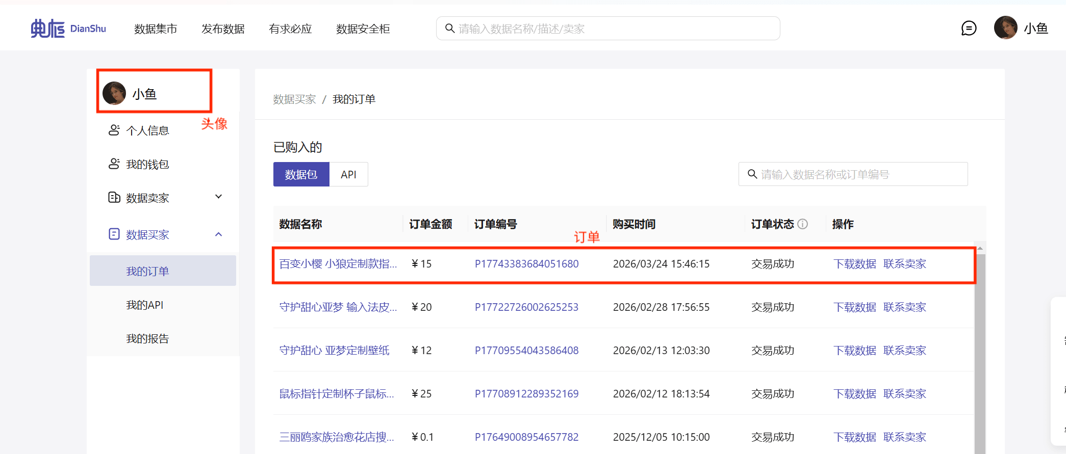 购买后在“右上角头像——数据买家——我的订单”中截订单状态为“下载完成”的图片(需要带你典枢的头像)