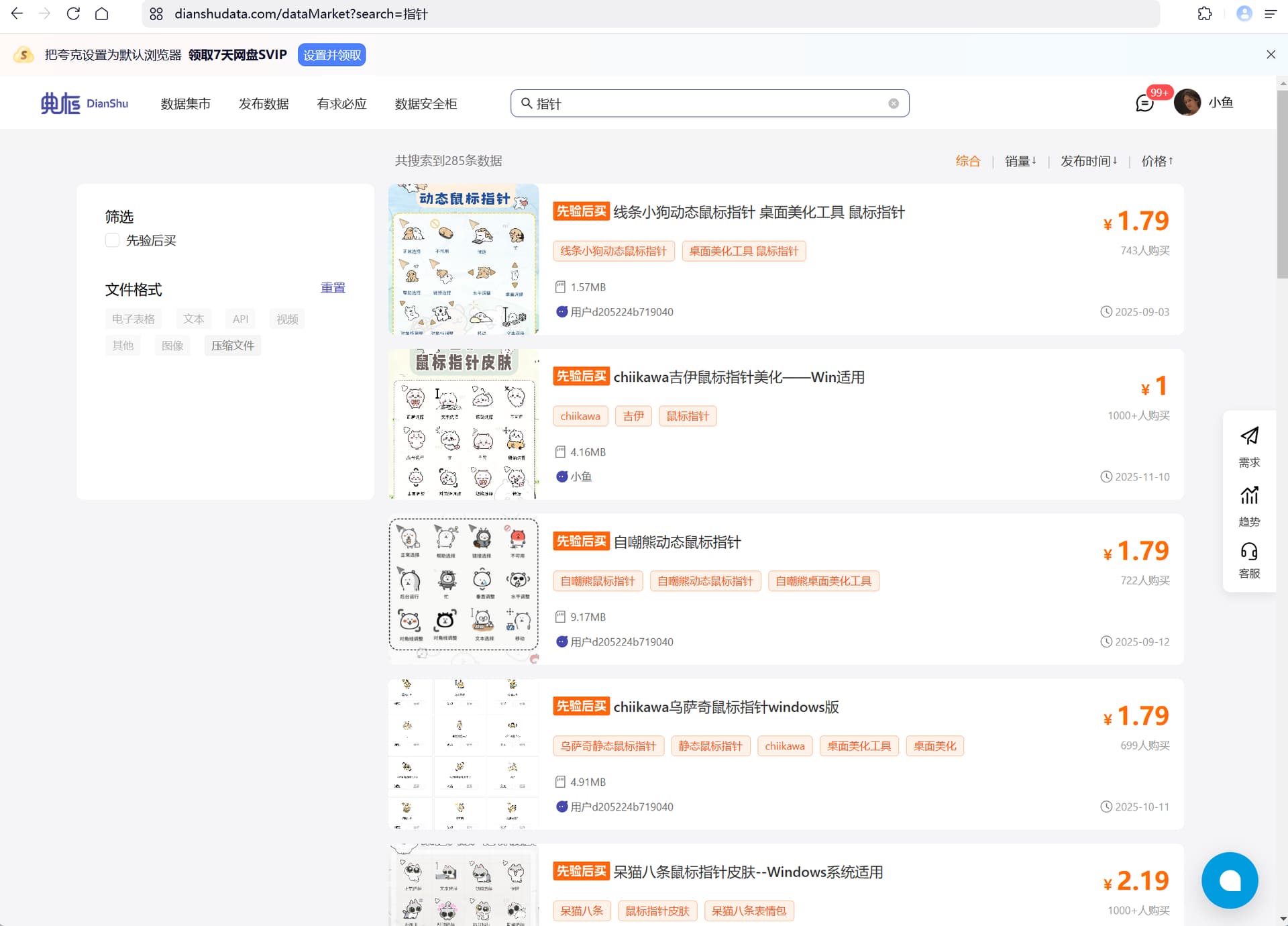 3、在https://dianshudata.com/ 中搜索关键词:指针,挑选你想要的任意一款指针皮肤购并下载(注意win和mac的版本,买错不换),